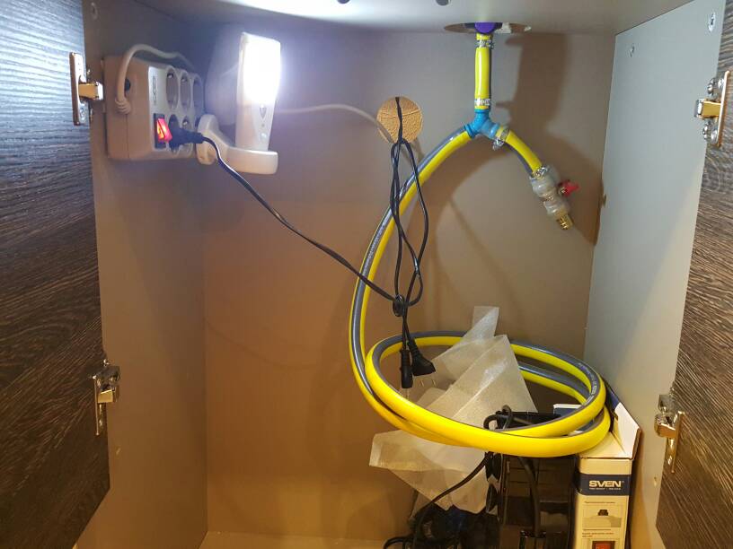 внизу у банки с завода сделан слив, для удобства подмен воды. я его модифицировал. Через двойник одна часть с краником для под подмен, другая на фильтр fluval g6. Добавил розетку и свет на сенсоре, что бы включался при открытии створок