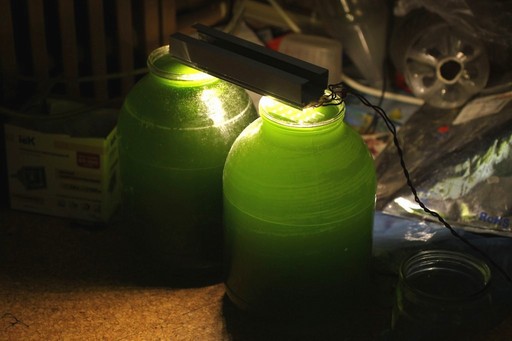 Ну а противоположный пример - это первый успешный опыт. Аквариум с личинками стоял в метре окна в таком положении, что прямое солнце не попадало. Ночью работал светодиодный светильник на 3-4 ватта. Этого было достаточно, чтобы тетраселмис рос быстрее, чем выедался.