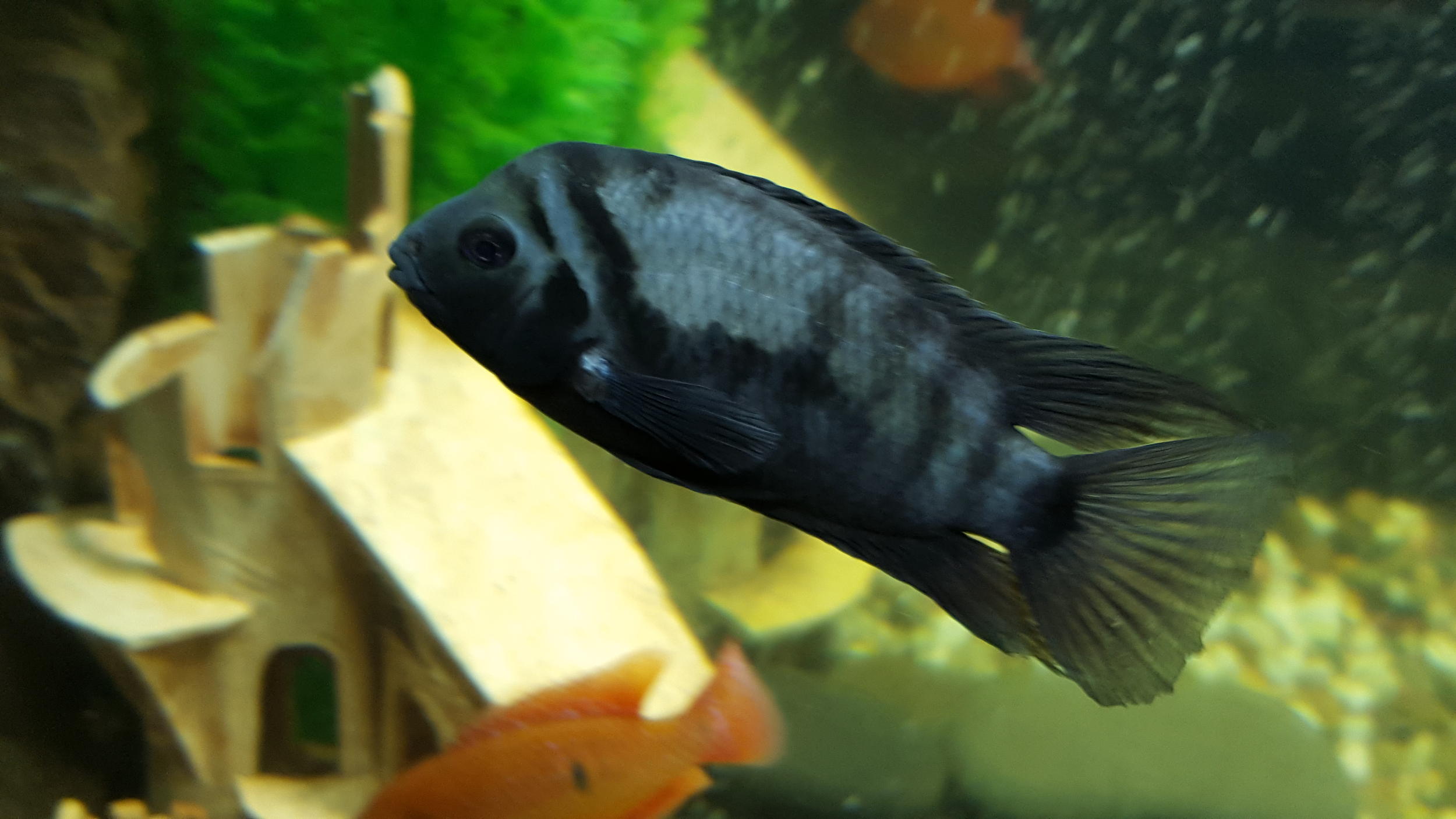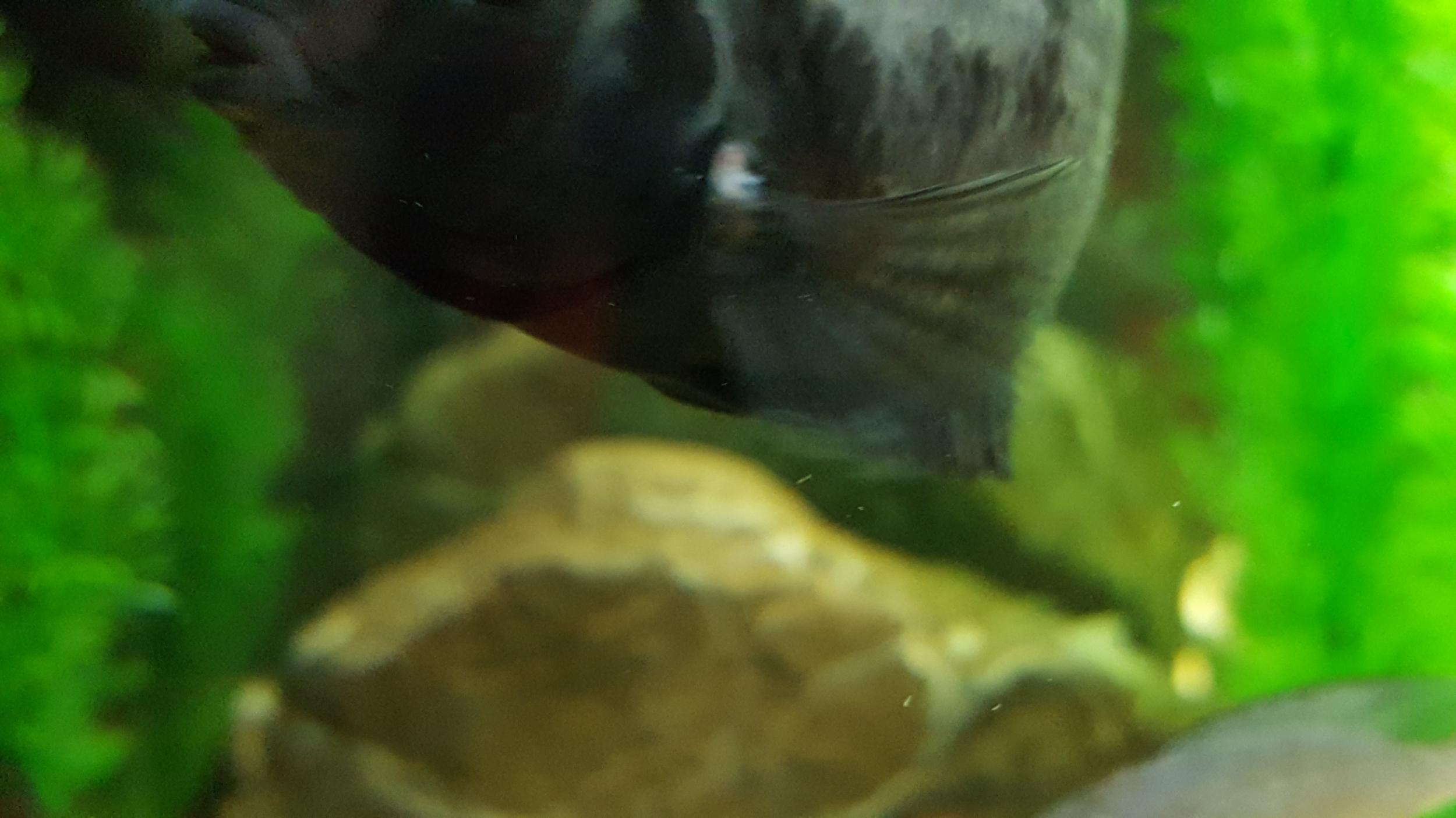 Смущает только чернополосый самец. Фото прилагаю. У него какая то рана, дырка (увеличивается со временем), а так же на одном из плавников что то похоже на рану, попытался его поймать для фото как смог.