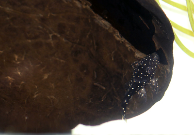 Очередной нерест произошел 29 марта. На кануне выклева возле трубки стали появляться икринки и пришлось вмешаться. На скорую руку из шприца для тортов был сооружен инкубатор. В отличии от самцов L 340, которых совершенно невозможно, при необходимости, вытряхнуть из трубки, наш "родитель " покинул трубку без проблем. Некоторые икринки были приклеены к керамике и пришлось применить силу, что бы их отделить. По видимому, они были травмированы. На видео видно "тень" личинки, которая еще жива, но, наверное, ее желточный мешок был поврежден моей неумелой "операцией".
