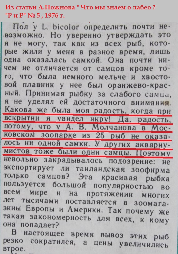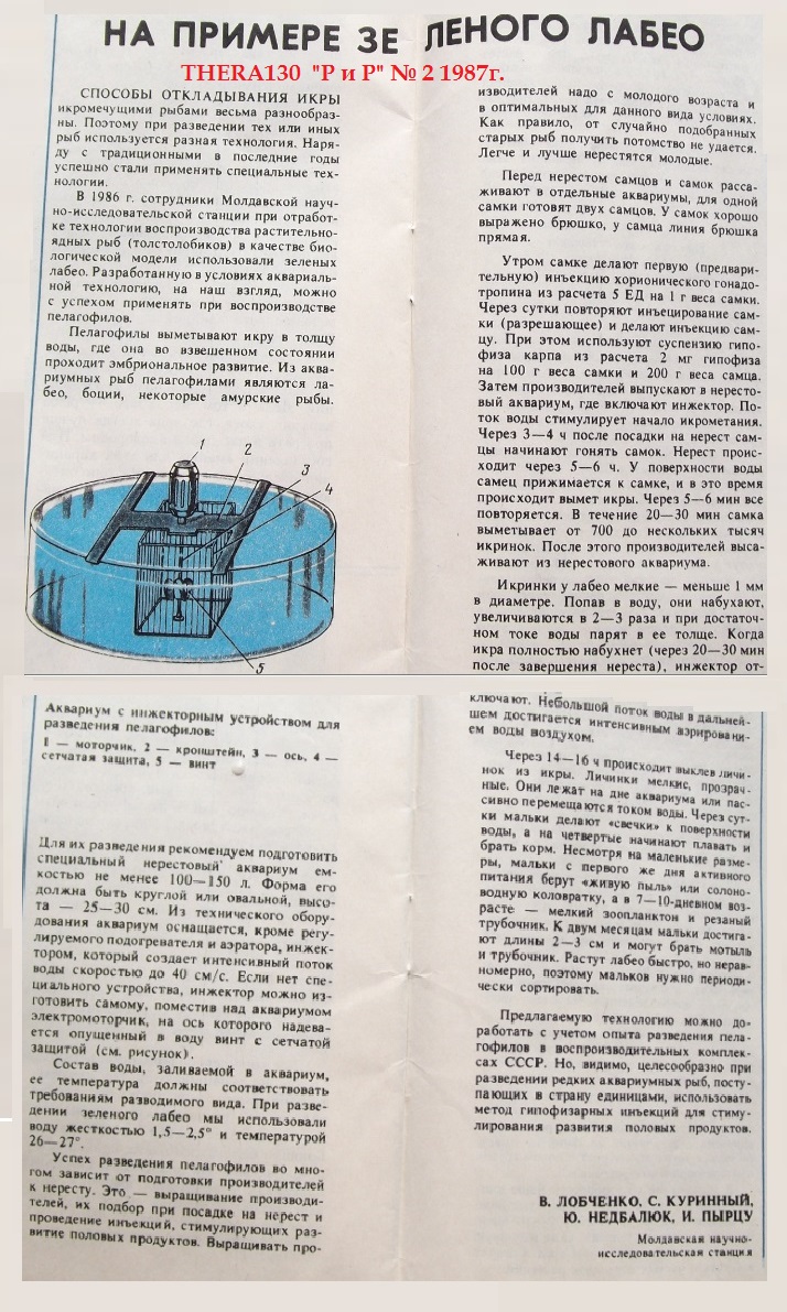 Вчера залез в свой "лабаз" , просмотрел литературу . Фото сделал прямо со страниц "Р и Р" . Думал , как и ты , Слава , что лабео разводятся только с помощю инъекций , но оказывается описываются редчайшие случаи естественного разведения лабео . На фото 1 , статья извесного в прошлом разводчика А.Ножнова , о самопроизвольном нересте в США в аквариуме зоопарка . На фото 2 статья А.Ножнова , где описан один из редчайших нерестов в Москве у разводчика Виктора Лебедева (правда не биколор , L.frenatus). Поэтому вступлюсь за Мишу . Все реально . Если у него это получится , то обязательно выпью за его успех , вместе с Вами , хоть и не употребляю спиртного уже 15 лет ! Хотя , как говорил проф. Преображенский - зачем из собаки делать человека , когда любая баба может его родить ! В связи с этим высказыванием проф.Преображенского , на всякий случай на фото 3 , статья из журнала "Рыбоводство и Рыболовство" о разведении лабео с помощю инъекций зто не особо сложно . В Харькове первым в 80-90-2000х сотнями тысяч разводил лабео и другую инъекционку Олег Рудавский(Косичка) См. фото 4 . . . . .