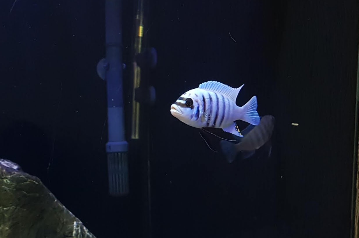 Власть в аквариуме сменилась! Долгое время за старшего был здоровенный самец Мetriaclima tarakiki (где-то 14-15 см), но за последние две недели самец Metriaclima fainzilberi Maison Reef заматерел окончательно! Несколько серьезных боев между ними и уже мэйсон занял всю правую сторону аквариума, постоянно яркий цвет, а таракикки теперь плавает в общей группе и чаще бледно-голубой, а не яркий.