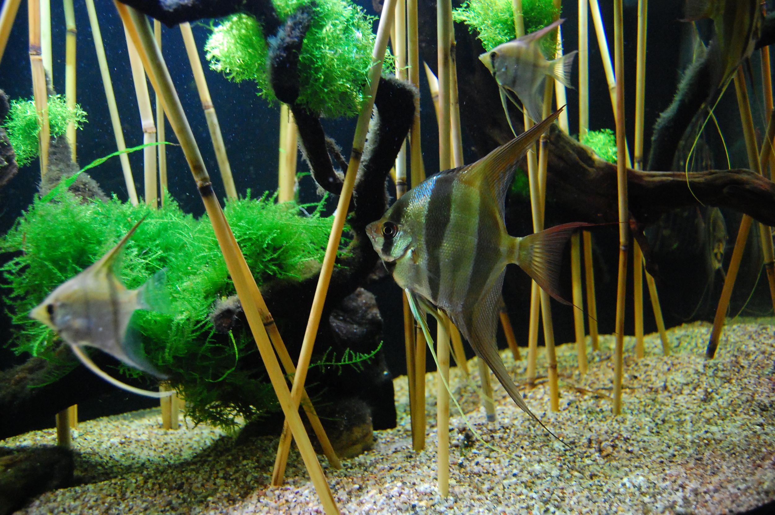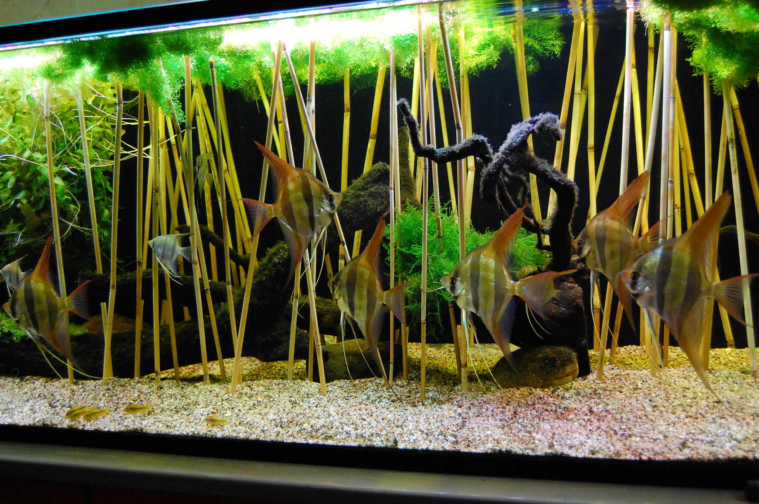 Я недавно видел подводное видео скалярок, так там у них был не камыш а нимфеи кубышки - надводные листья и длинные черешки. Было прикольно. У вас как то сильно забор получился.