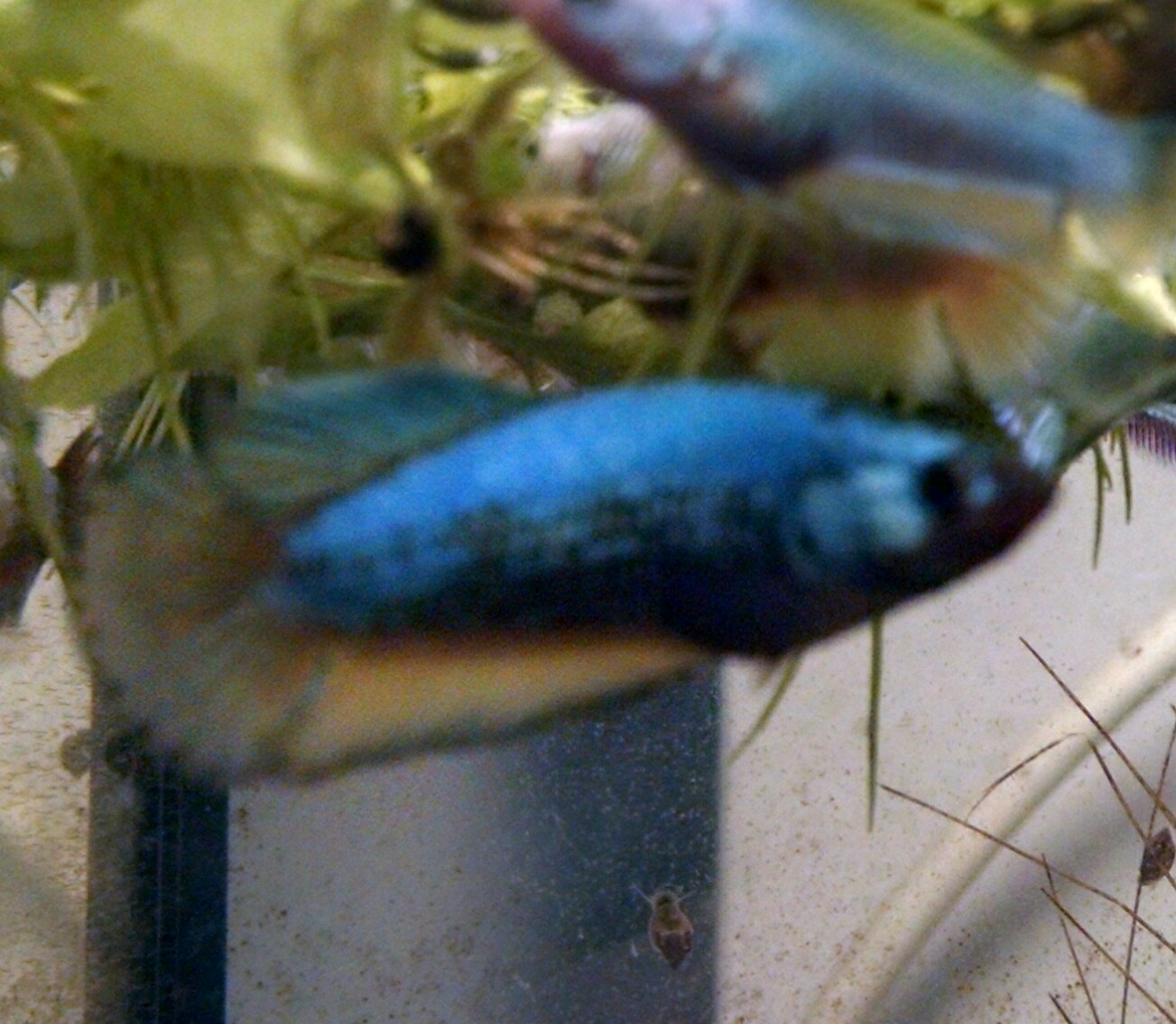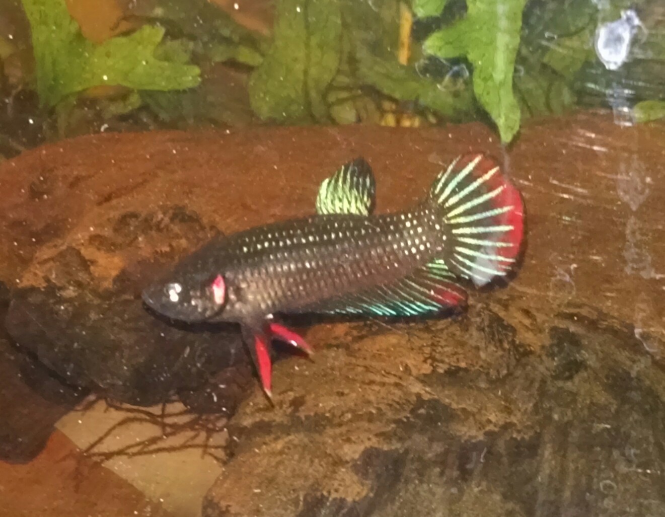 Очень черный, намного темнее Imbellis-а (иногда невозможно отличить от декораций). Активный и достаточно агрессивный. Бросается не только на отражение в грелке, но и на палочку для кормления...