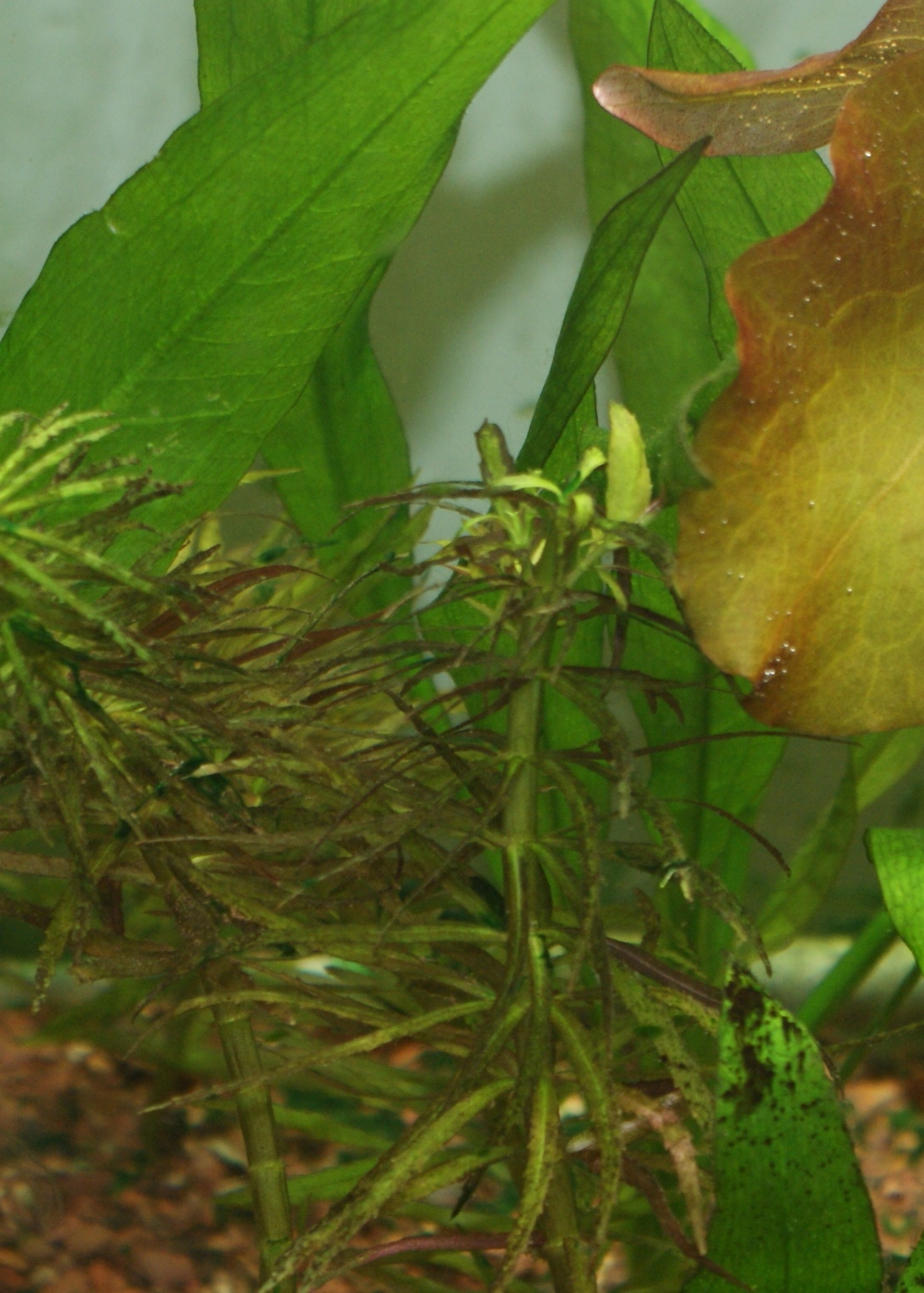Прошу совета по гигрофиле,я ее недавно посадил,у нее верхушки как то изогнулись вниз!может света много?А снизу из стебля лезут новые растения.