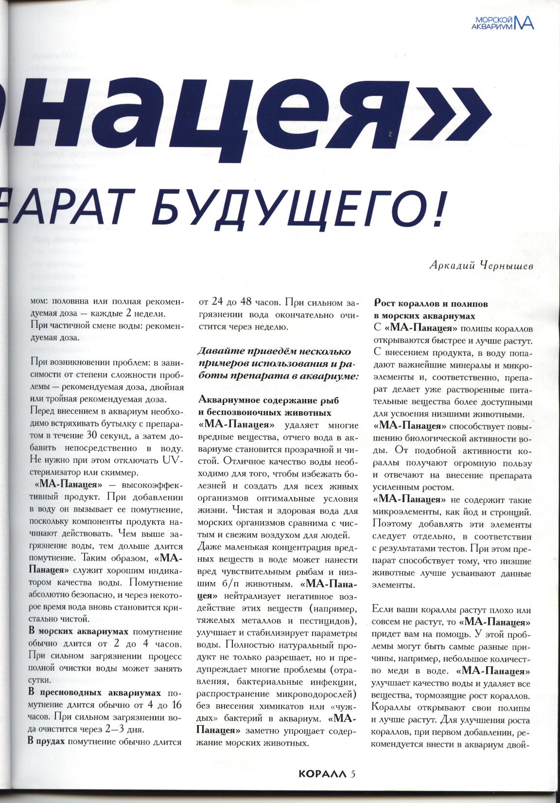 В заключение, хочется подвести итог и выразить надежду, что этот удивительный препарат «М А -Панацеи» действительно станет большим подспорьем для каждого аквариумиста и прочно зарекомендует себя на российском рынке. А в наших морских и пресноводных аквариумах, прудах и палюдариумах будут жить и приносить нам радость здоровые, красивые и такие удивительные подводные обитатели.
