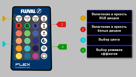 Пульт дистанционного управления FLEXPad дает возможность управлять интересными световыми спецэффектами (имитировать облачное небо или вспышки молнии)