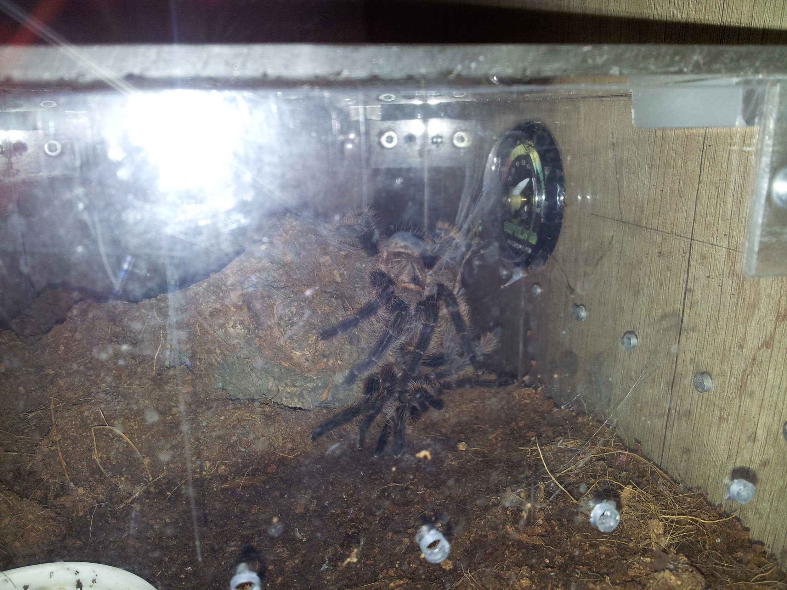 Через 40 минут паук был на стенках. И всю неделю что стояла дикая жара, паук вел себя крайне беспокойно. С самого утра и до ночи упражнялся в альпинизме. Пришлось еще полбрикета грунта высыпать, чтобы она себе гарантированно ничего не отбила.