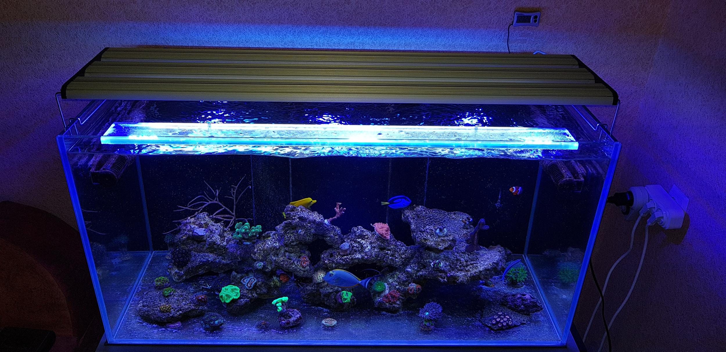 И две лампы т5 ATI по 39wat, блю плюс и корал плюс (пока), может оставлю, может белую поменяю на корал плюс. Буду смотреть по кораллам.