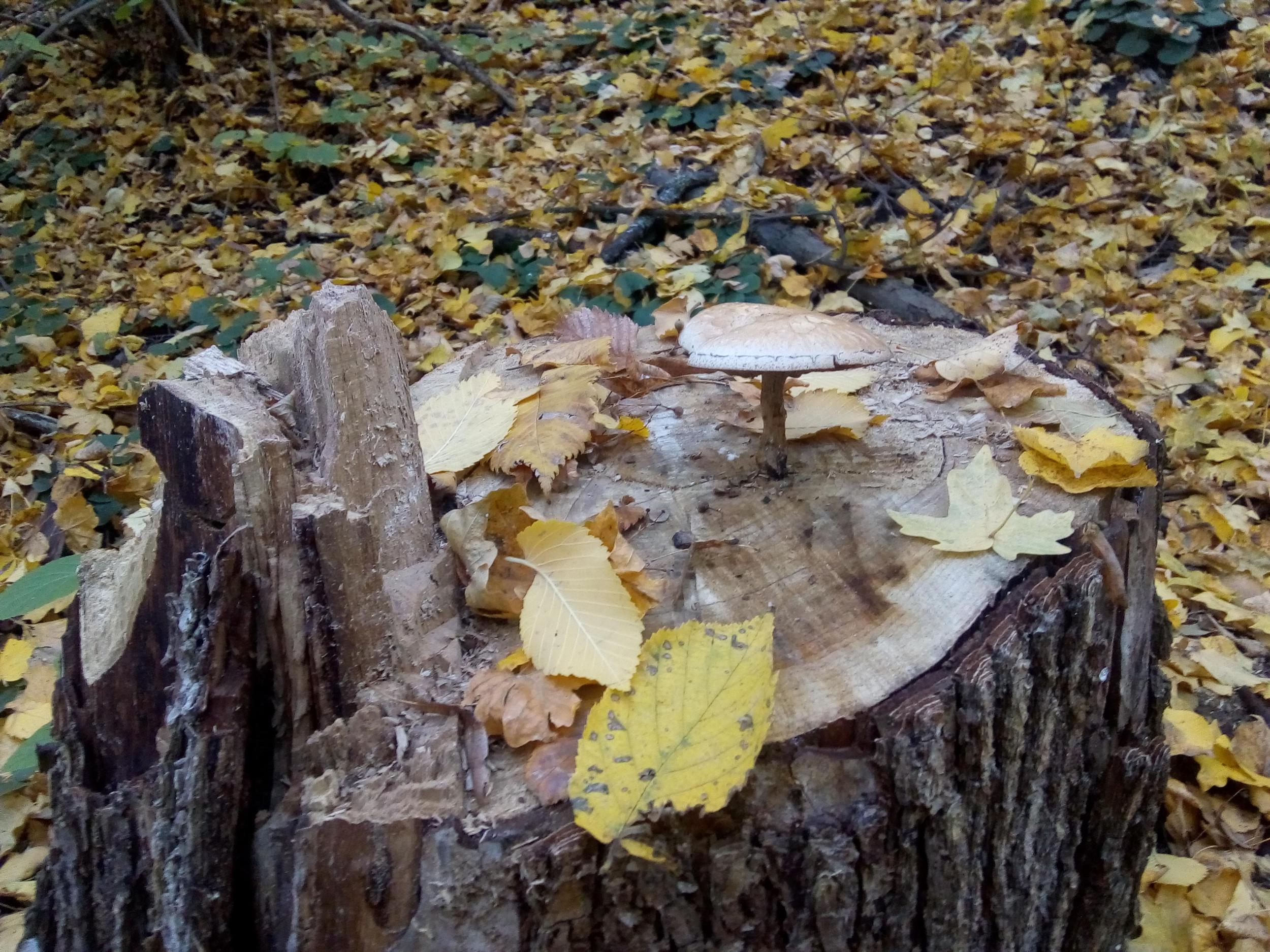 Вид гриба на пеньке не знаю, но он интересен с другой стороны. Дерево собственноручно завалено в июле этого года, т.е. спил совсем свежий - а гриб уже есть.