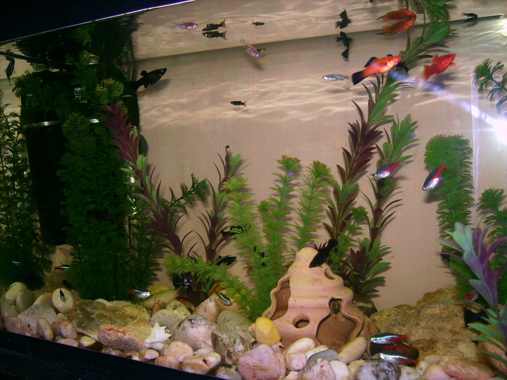 У меня аквариум 70 л.(может чуть больше). Стоит фильтр Акваэль фан 2 плюс (фильтру около 1,5 лет, работает стабильно). Рыбы - моллинезии, 15, неоны - 12, по 4 данио и меченосцев. Растения искуственные. А, еще 4 улитки. температура 25 градусов.