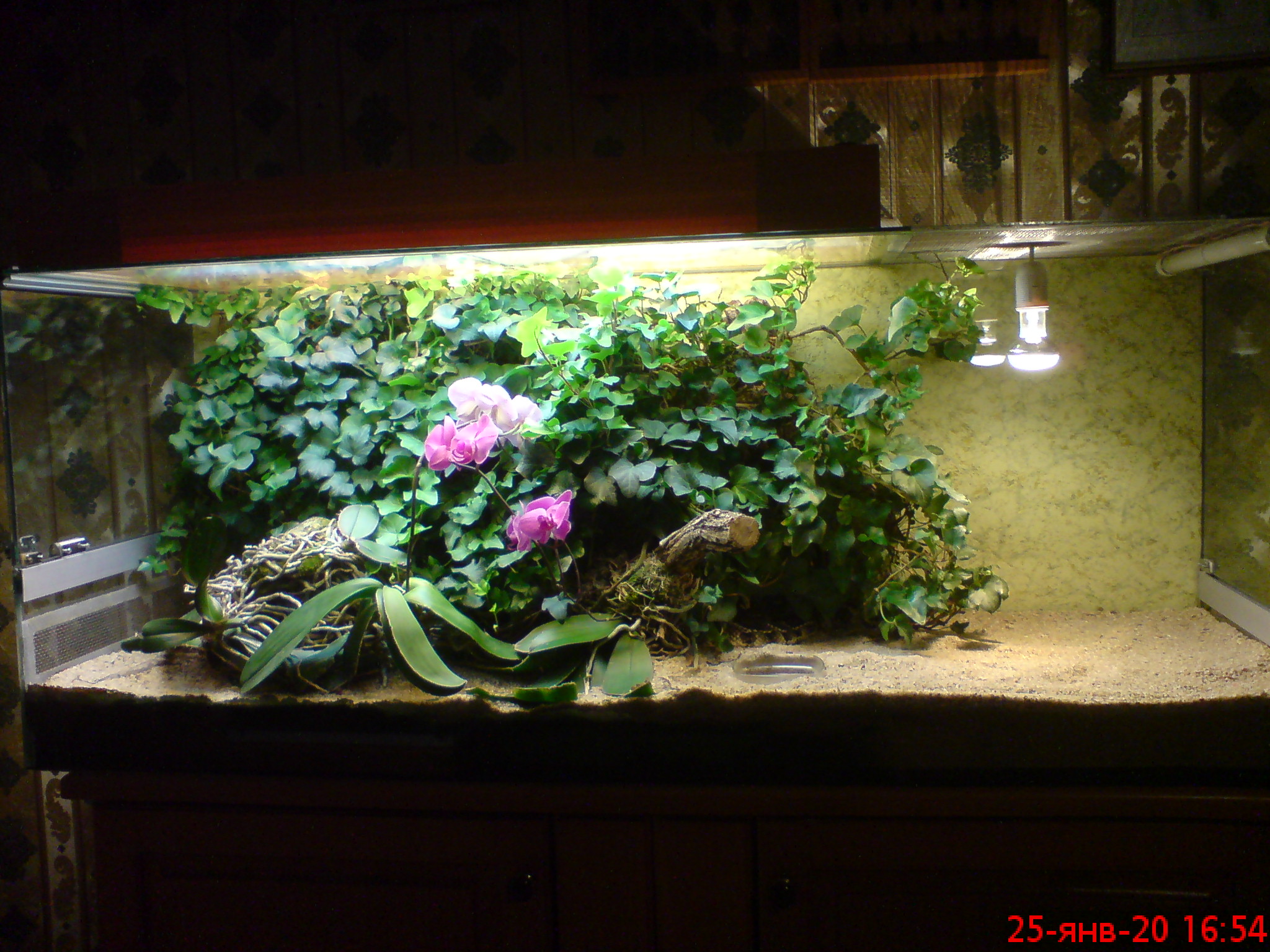 7 лет террариуму.. пенек что был слева сгнил полностью.. рассыпался в труху.. орхидеи убрал в горшки. можно было бы их посадить по другому.. но гадюки большие и мне с этими зарослями .. трудно с ними работать решил оставить больше места им..