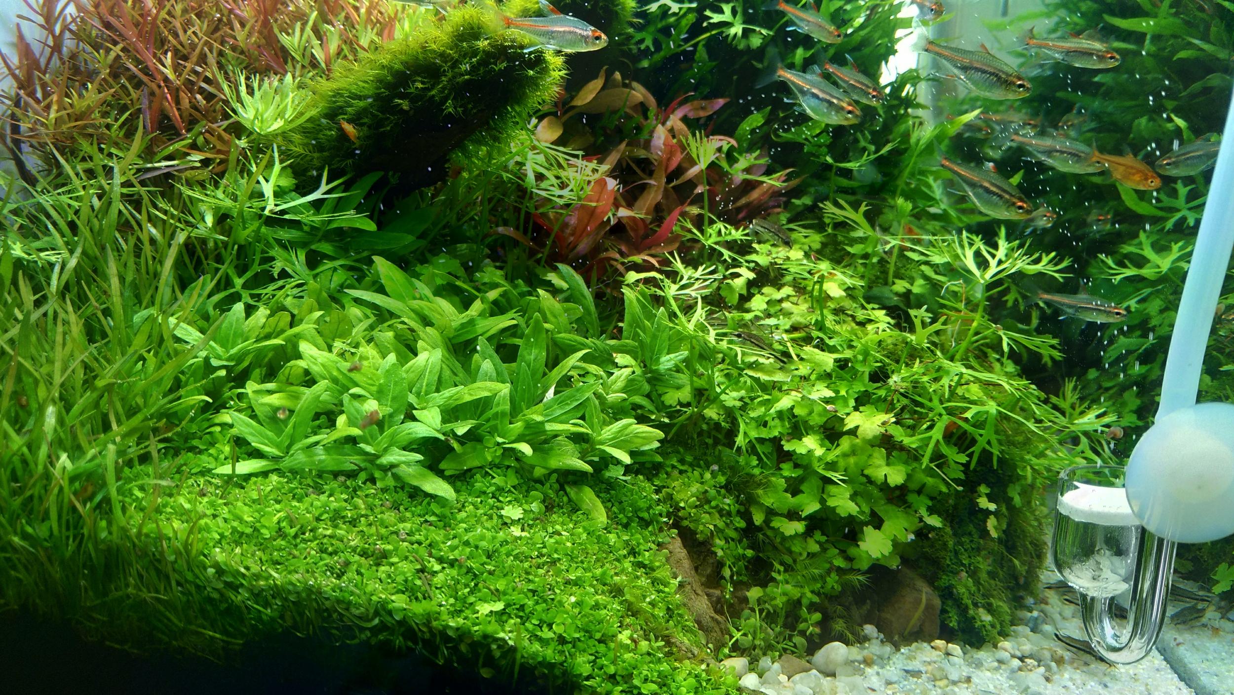 Акваріум тьфу тьфу схоже вийшов із "штопора" після бактеріального спалаху. Вода прозора, рослини в чудовій формі. Поодинокі водорості вже зникли. Рослини, з якими були труднощі ще півтора місяці тому, зараз виглядають дуже добре, стаурогін і ротала грін от прямо радують. Поживні таблетки в ґрунті працюють. Навіть здається ротала H'ra стала червоніша. Ротали я стриг менше двох тижнів тому і стриг дуже низько, тому ще повноцінна "шапка" не відросла, але кольори того, що відросло мені подобаються.