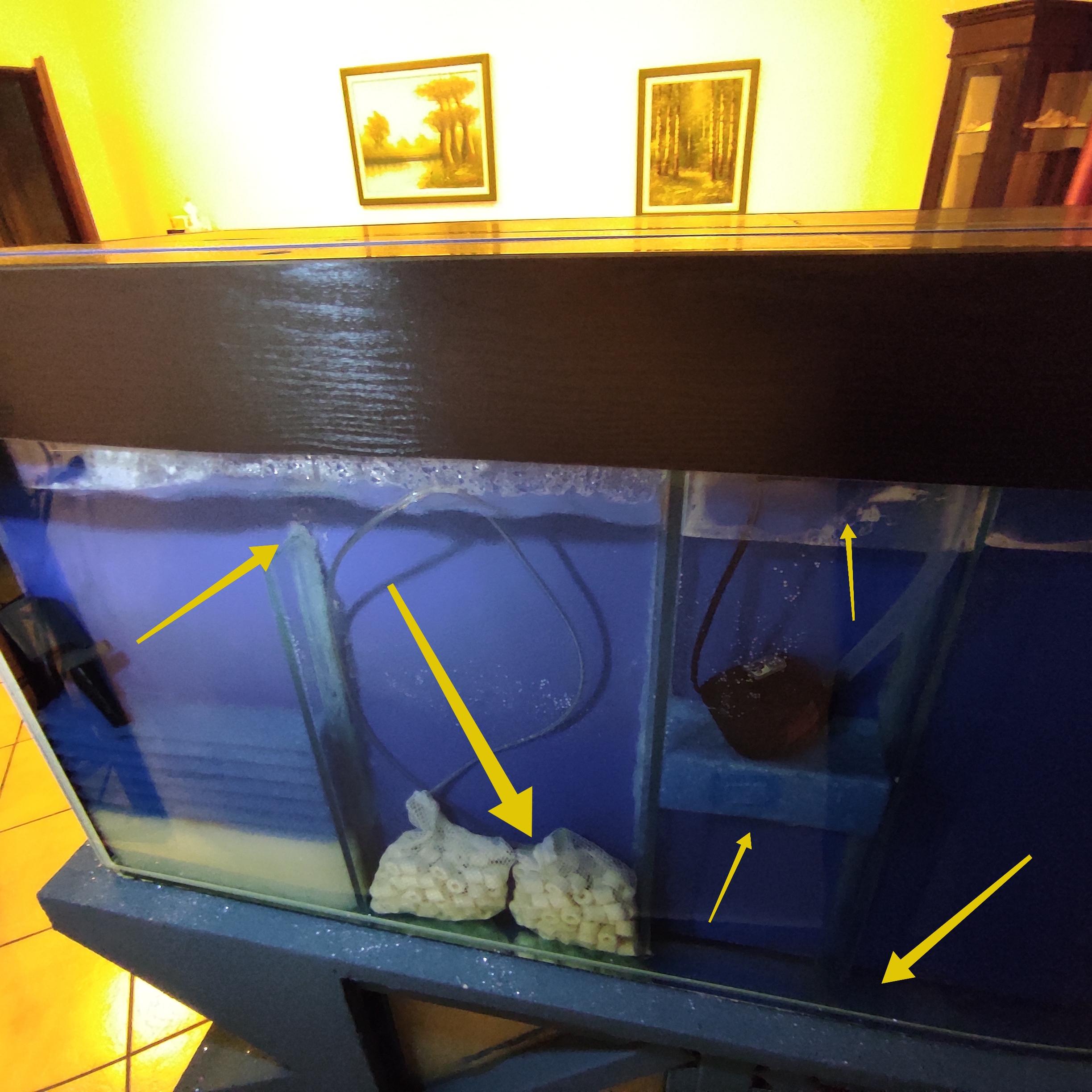 За синей перегородкой стеклянная ниша, где можно разместить аэратор и другое оборудование. Сверху дырки под провода по бокам, и маленькая дырка в среднем отсеке сампа в аквариум идёт. Возможно вы правы и там надо делать возврат воды