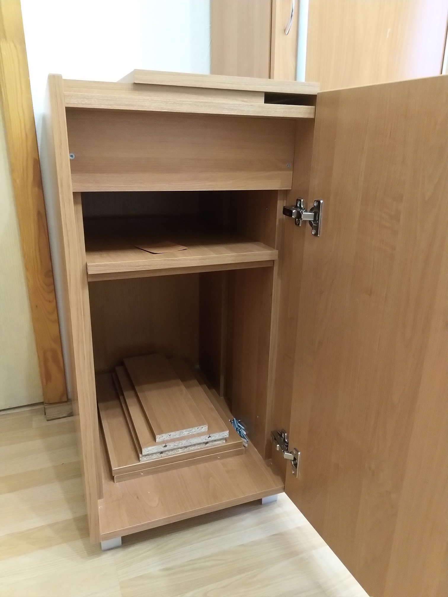 Тумбу решил делать самостоятельно. Из ДСП 18 мм. Цвет - ольха. Кромки ПВХ 0.5 и 2 мм.