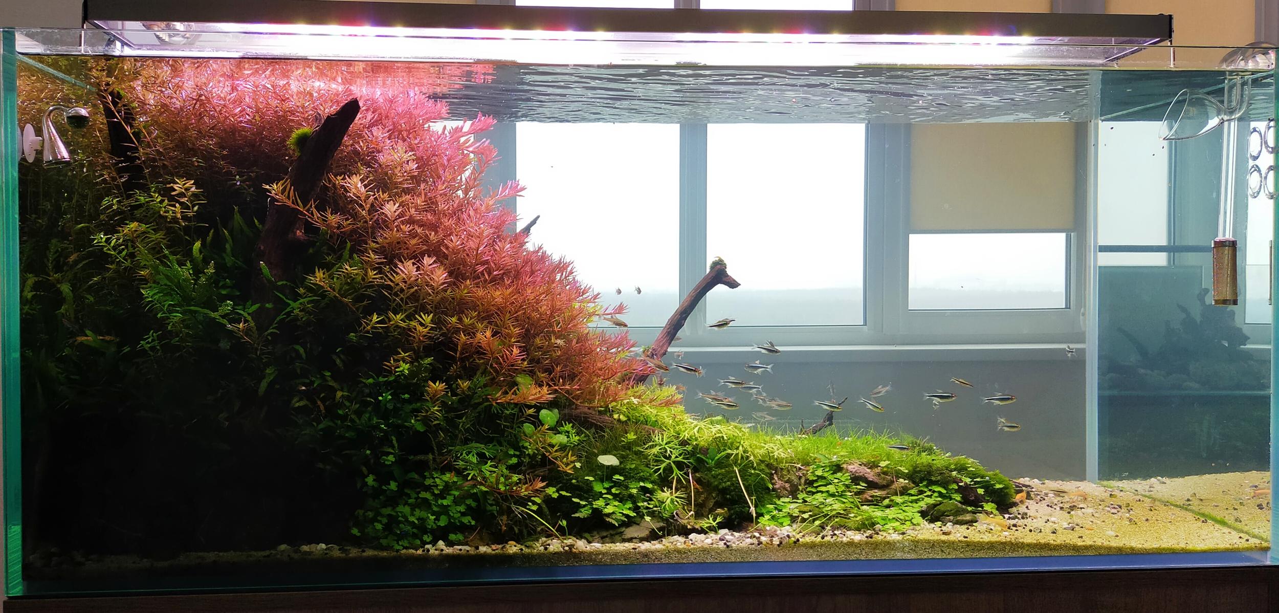 Давненько я не показував свій акваріум. На те був ряд причин, окрім ліні. В квартирі потекла труба опалення під підлогою, довелось зливати воду, пересовувати акваріум, знімати ламінат, обробляти стяжку від грибка і таке інше. Також в акваріумі кілька місяців тому були проблеми з нитчаткою, імовірно зі спірогірою, кілька разів наче перемагав її, а вона знову поверталась. Тьфу тьфу, зараз наче не бачу. Обробляв то альгошоком, то перекиссю. Борода теж в акваріумі була, вона і зараз де не де присутня, але то не проблема. Є де не де на корягах і камінні, мабуть пора замінити у фільтрі purigen. На рослинах бороди нема. Та і загалом рослини радують, окрім стаурогіна повзучого. Щось він тут геть поганенько росте, в чому причина поки не з'ясував. Можливо йому нітратів треба більше, в мене тут нітратів дуже мало, але цілком можливо, що тест здох, треба було б купити новый. А можливо є якась сезонність в цієї рослини, в минулому акваріумі помічав,, що стаурогін буває росте дуже добре, гарно переносить стрижки, а потім стає на кілька місяців.