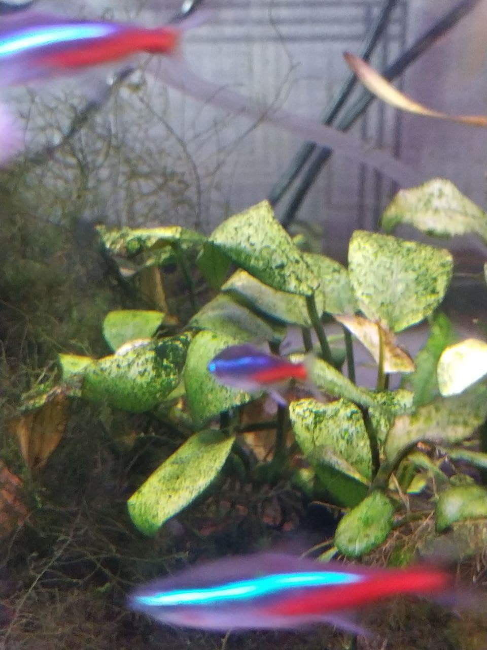 Анубиас-весь в зеленых точках и пятнах, сначала рос, теперь перестал.
