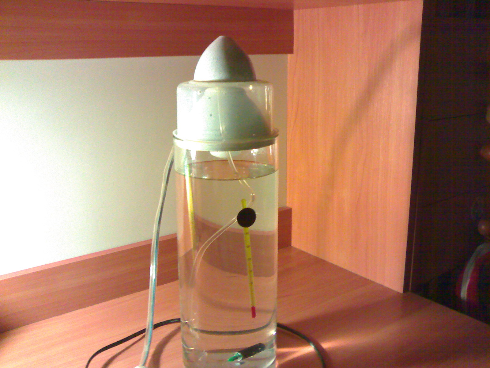 После покупки ваза заняла почетное место наверху книжного шкафа, в виду того, что надо было продумать устройство крышки с освещением, другого оборудования. Обдумывание заняло порядка недели, в результате были сделаны выводы: крышка должна быть легкой для устойчивости, крепиться жестко, иметь отражатель в виду высоты столба воды. Выбор материала был сделан в пользу пластмассы. Вооружившись рулеткой, которой были предварительно замерены диаметры вазы, начались походы по магазинам, супермаркетам в отделы освещения, посуды. В результате был приобретен пластиковый контейнер для продуктов, пластиковая лейка. По размеру контейнер должен был входить в вазу, лейка соответственно в контейнер. Радости и удивлению не было предела, когда контейнер стал в вазу тютелька в тютельку – видимо их делают либо на одном заводе, либо специально под размер друг друга.