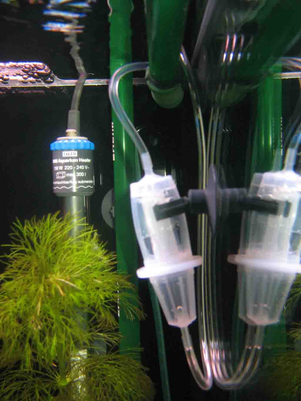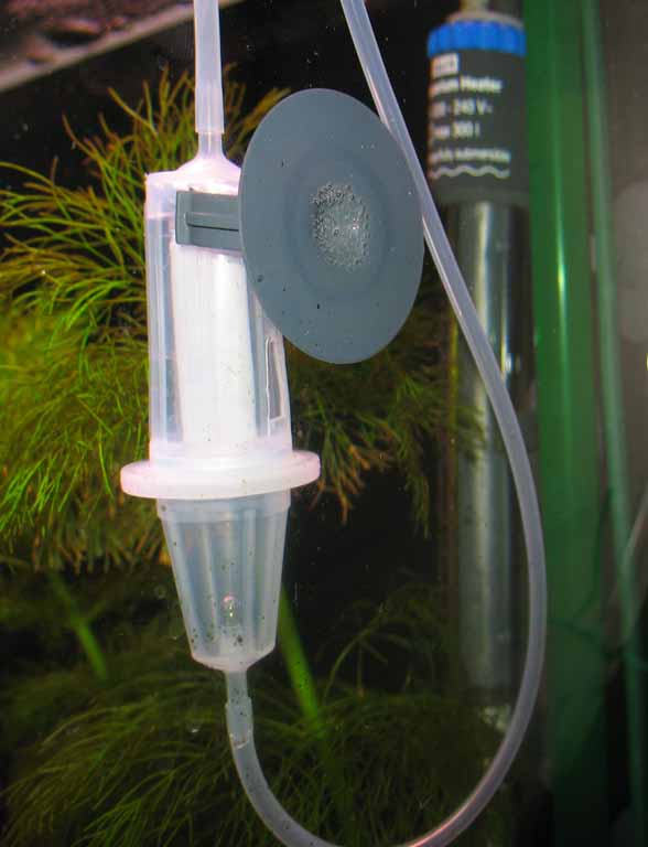 Сверху в одну дырочку флейты вставил маленький отрезок трубочки от капельницы, второй конец в стаканчик капельницы. Присоска - запасная от внешника, в результате небольшой напор воды подается сверху в этот стаканчик, а снизу подключена трубка с СО2.