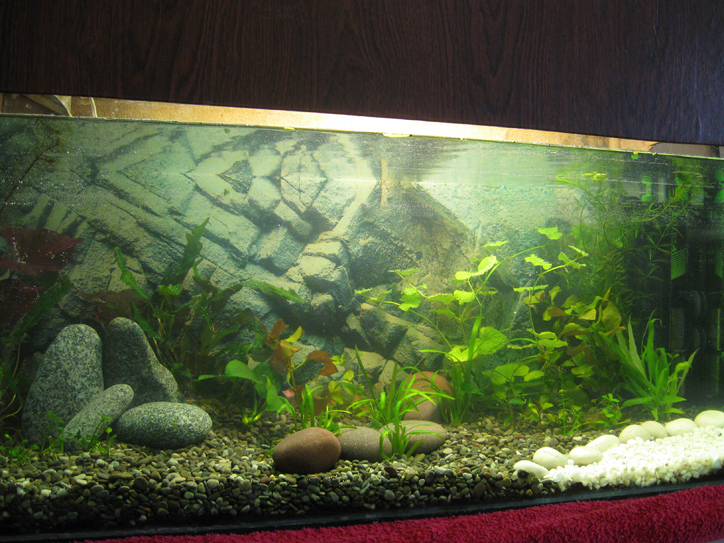 Наконец-то и я дождалась своего запуска. Имеем б/у аквариум 100л.Оборудование:фильтр:Tetratec In600plus (50-100l), обогреватель:Tetratec HT100(100-150l),крышку ещё не переделывали поому освещение ужасное- лампы : пока 2 длинные 18 ВТ и 100 Вт энергосберегающая. Воду наливали отфильтрованную и добавляли био-стартер (две таблетки).Что ещё фон на глицерине, грунт- торф, глиняные шарики (собственного производства из аптечной глины и удобрения для кактусов ) и морская галька 3-10 мм.