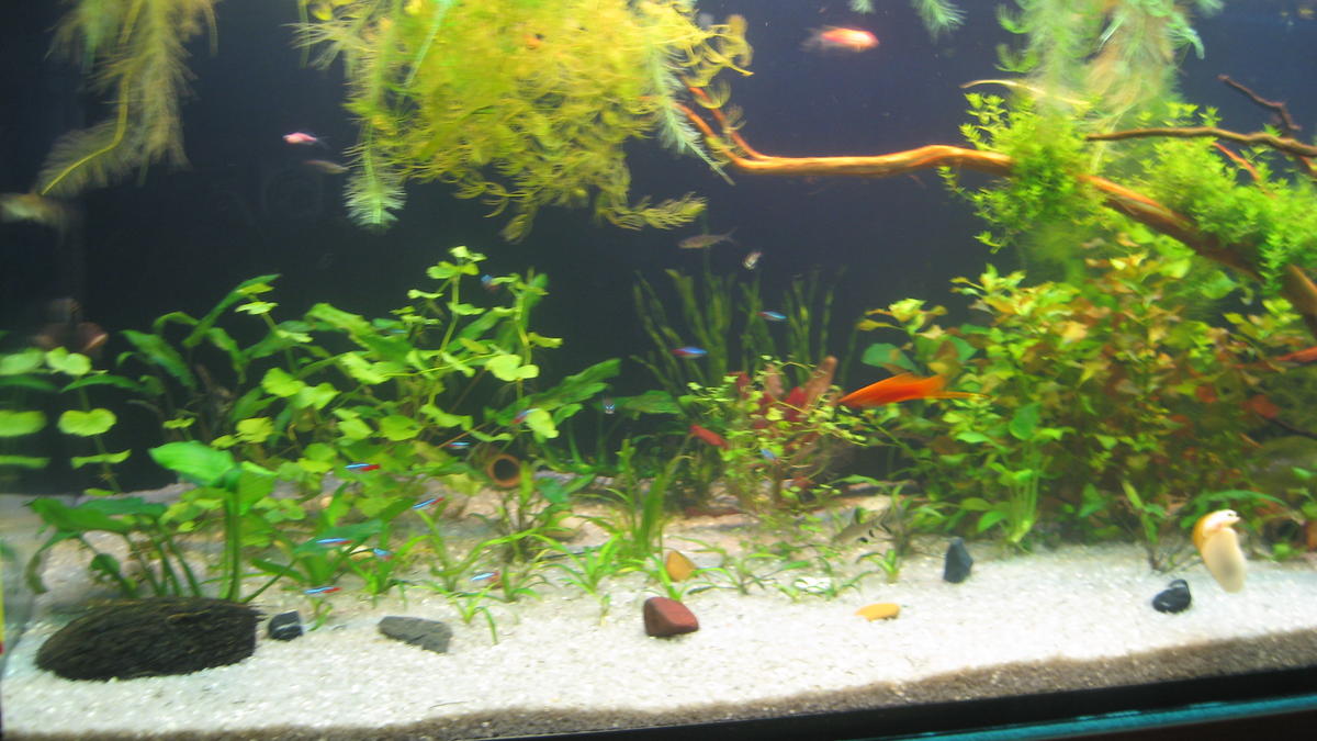 Заселено: данії 3 шт, барбус вишневий, меченосці 3 шт, кардинали 2 шт, неони 15 шт, скалярії 4 шт, акулій-балу 3 шт, анциструс 6-7 шт, сомик крапчатий 2 шт, хелени 4 шт, ампулярії 4 шт, кольцерука креветка 4 шт.