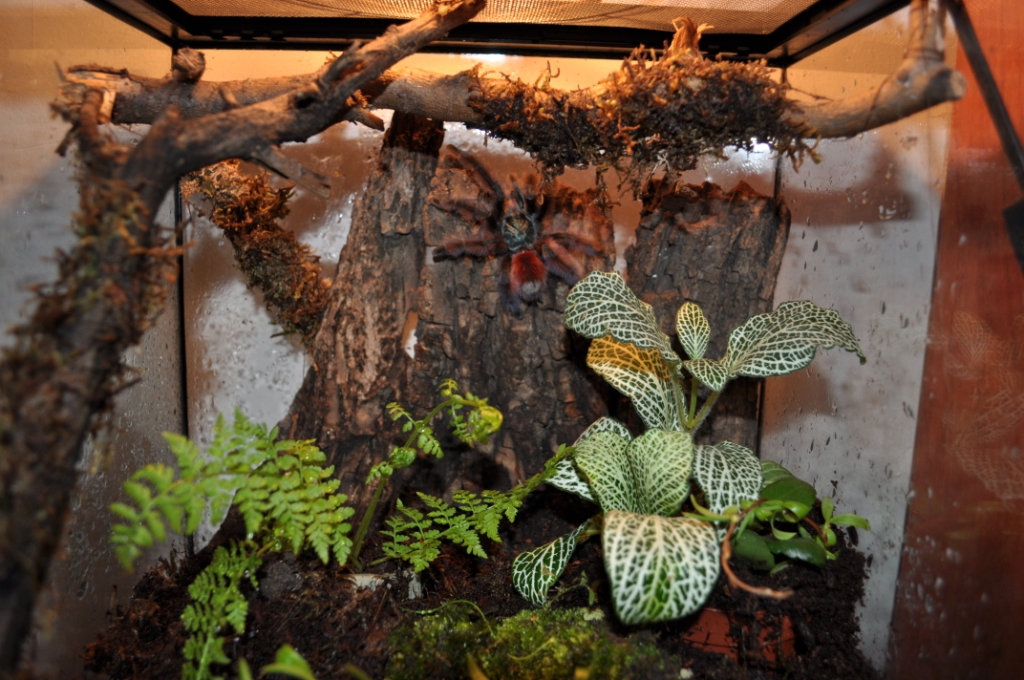 Copone2244, Декорирование растениями требует сильного освещения.Обычно декорируют по случаю, на время. Искусственная подсветка люминисцентными лампами в малом объёме оказывается всё равно недостаточна для длительного удержания фитонии у грунта.Они потянутся вверх,теряя декоративность,красный цвет будет уходить с листовой пластины.Нужен высокий террариум.Вот, как в нём всё это выглядит при среднем освещении, приемлемом для паука и постоянном присутствии фитоний.. При точечном освещении всё будет красивее,но точечное освещение дорого по электричеству и морочно в установке осветителя и эксплуотации террариума.