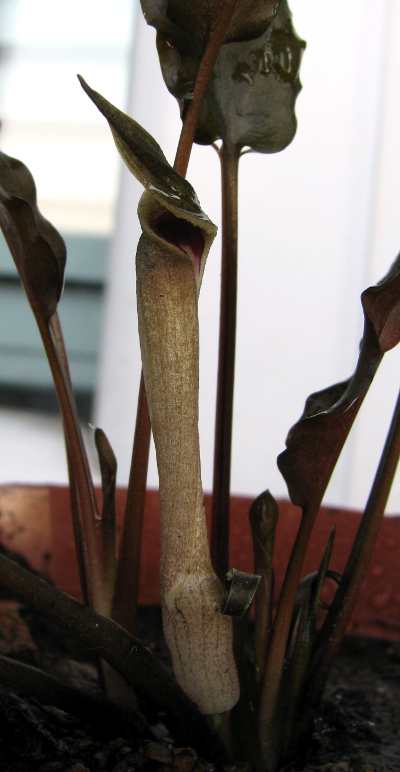 Цветение Cryptocoryne wendtii var. wendtii цветок почему то полностью не раскрывается... хотя читал где то что многие криптокорины открывают цветок ночью.В нутри цветок красный с бел...