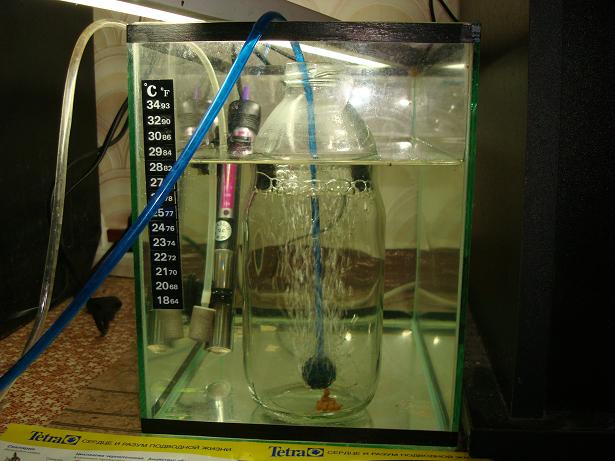Склеен маленький аквариум, в который аккуратно становится 6 таких вот бутылок стеклянных из под сока. в аквасе остается место для обогревателя. В кажду бутылку опущен ПВХ-шланг и шарик-распылитель. Количество нагнетаемого от компрессора воздуха регулируем краником. Вода в бутылке наливается до начала изгиба к горлышку. Шарик-распылитель лучше чтобы не доставал до дна 2-2,5 см. Тогда ток воды не очень сильный , но и икринки/личинке находятся в постоянном легком движении, чего вполне достаточно. Замена воды происходит при помощи такого же ПВХ шланга, как и подача кислорода - половину слил, половину таким же путем долил. Просто, дешево и удобно. Потому как не каждый может склеить инкубатор из оргстекла, да и не каждому он нужен, кто не занимается целенаправленным разводом инкубирующих видов.