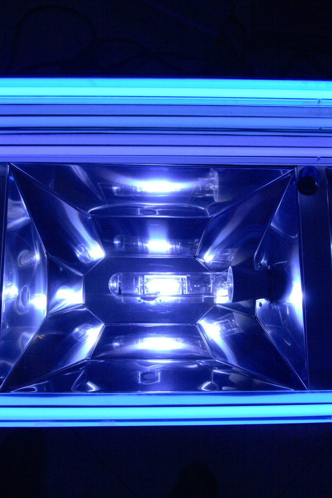 Общий размер светильника 1550х600. 2 отражателя по бокам под МГ250Вт. Всередине под 400 Вт. + 4 независимых отражателя под Т5.