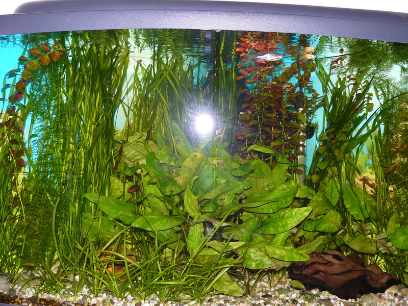 Добрый день. Аквариум давно но растения никогда толком не росли, через какое-то время после покупки пропадают. Вобщем решил разобратся и навести порядок. После летнего коллапса с полным заростанием аквариума бурыми водорослями, в супе остались живыми 2 цихлиды. Полностью очистил аквариум, промыл грунт, купил новый фильтр. К стандартной 15Вт лампе на крышке добавил патроны еще под 2х15Вт. После нового запуска две недели назад появились неприятные изменения по поводу которых прошу совета. Анубиас при том что появились новые листочки хиреет на глазах. Старые листья и водяные корни покрываются налетом и сьеживаются, появляются отверстия. В местах где остались остатки бурых заметен рост (на переднем плане 2 гальки желтеют). По остальным растениям динамики пока нет (посажены в эту субботу). Роголистник с пляжа вроде прижился и растет. Папоротник вроде повыпускал новые листья, но старые заметно хиреют. Посоветуйте пож что убавить- добавить (свет, оборудование), чего не хватает анубиасу, как остановить рост бурых (такое впечатление что им свет нравится) Форум читал стараюсь следовать рекомендациям, но живой совет лучьше