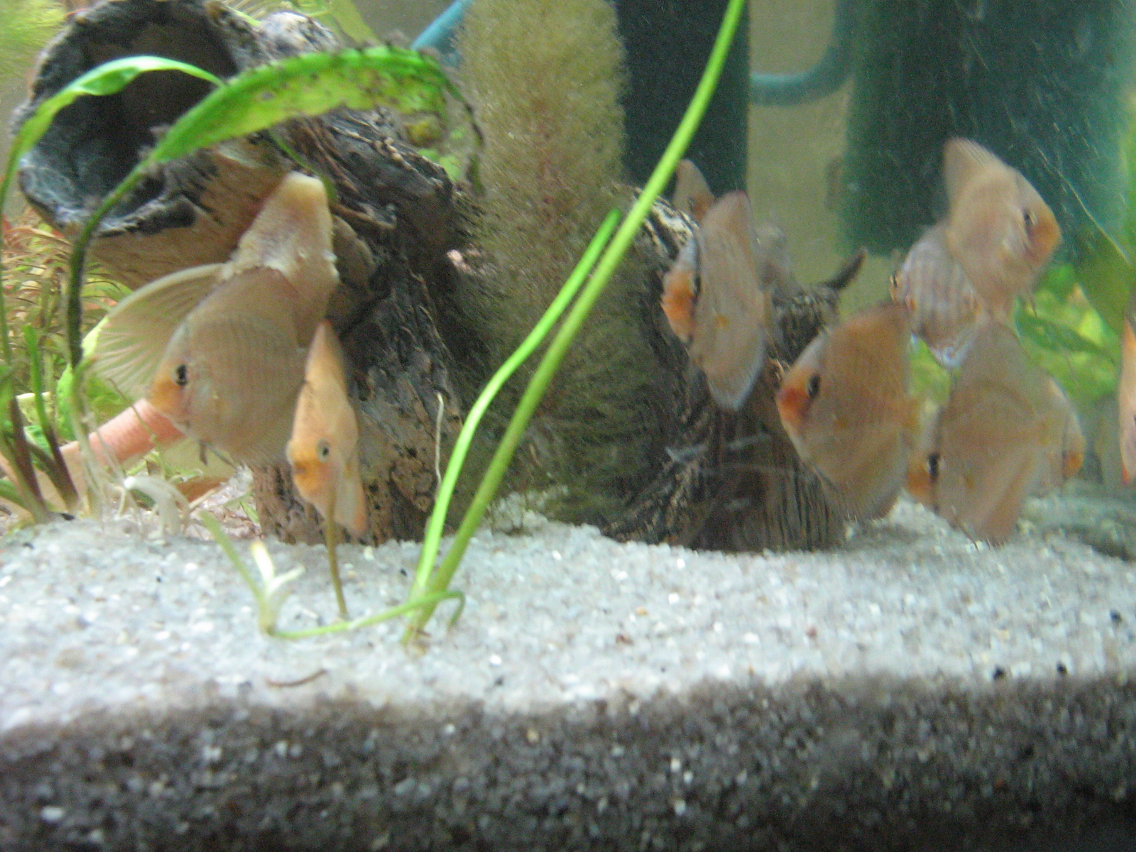 Доброй ночи господа . Обнаружил у себя новый "диагноз" называется дискусы . Даже не знаю чем это закончится , но 15 шт. уже взял . Очень прикольные малыши . Размером в рупь , любопытные и трусливые . Когда тушу свет в комнате они идут гулять . Стоит только шевельнуться , все сразу в дальний угол . С огромным трудом сделал пару фоток , чтобы похвастаться .