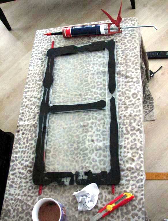 Приклеил боковые, вклеил одно лиценвое стекло. Мыльная вода - барахло, лучше кусок тряпки - просто оттер руки. Спички все же нужны - позволяют понять достаточно ли силикона. Лицевое клеил без спичек, слой силикона 3-4мм. Когда легло стекло большая часть вылезла наружу, во внутрь на шов мало что осталось. Зазор между стеклами 0,5-1мм :-( Разбирать?