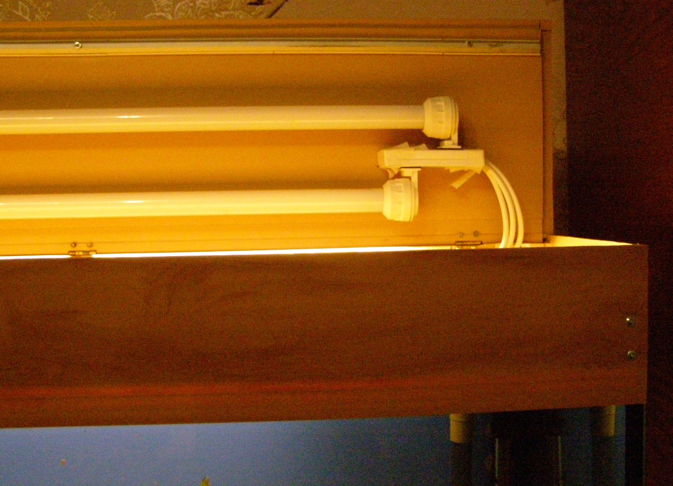 Выкладываю фото крышки аквариума в открытом положении, хорошо видно крепеж ламп. Пока не нашел фольги оклеить внутренность крышки.