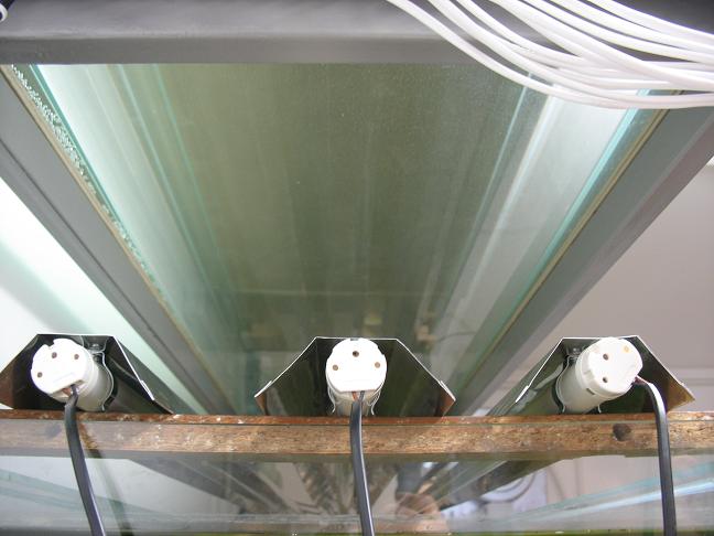 Всё не мог определиться как делать отражатели. Смотрел на зеркальную фолью и на алюминивую фольгу и на готовые железные крашенные отражатели и на профильную оцинковку. Все не то. А фирменные аквариумные отражатели на лампу 58 ватт стоят у нас где то в пределах 500-600руб. В конце концов на одной из металлобаз купил 1,5 метровый кусок рулонного алюминия толщиной 0,3мм, шириной 0,5м. Разрезал его вдоль на 3 части и изготовил 3 отражателя. Все затраты вышли не более 200руб. На фото: