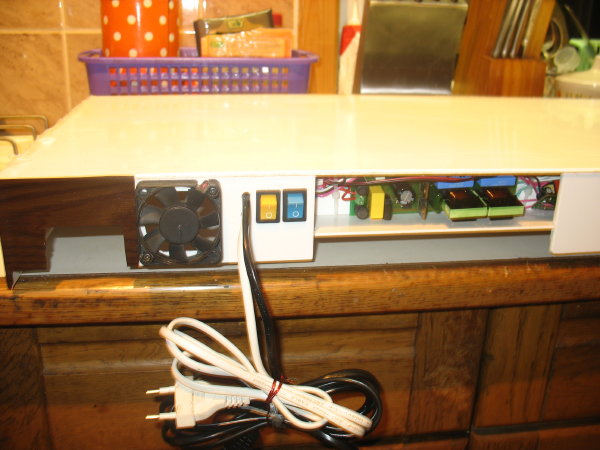 Сзади вмонтирован кулер для вентиляции, запитан от 7-ми вольт, не слышно. В крышку также вмонтирована система донного обогрева аквариума на 50Вт.