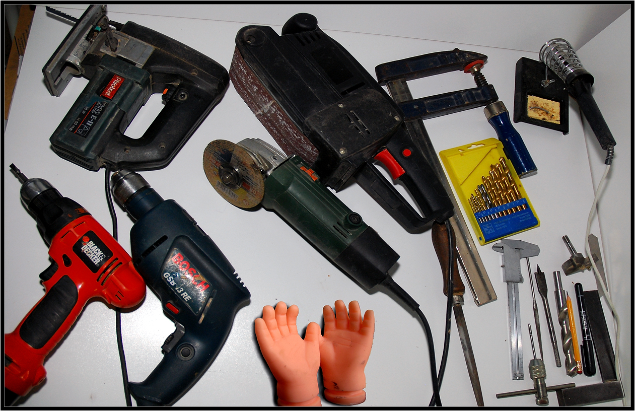 Болгарку и электролобзик можно заменить ножевкой по металлу  . Шуруповерт можно заменить дрелью и отверткой  . Кривые руки заменить нельзя  . Все остальное есть в каждом хозяйстве уважающего себя самоделкина.