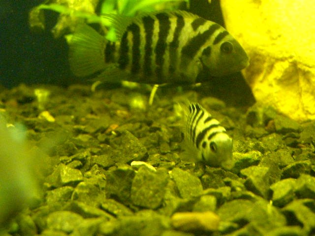 1. Чернополосых цихлазом (на обмен есть 3 пары, приносят потомство регулярно; Самцы около 7см, самочки 4-4,5 см)
