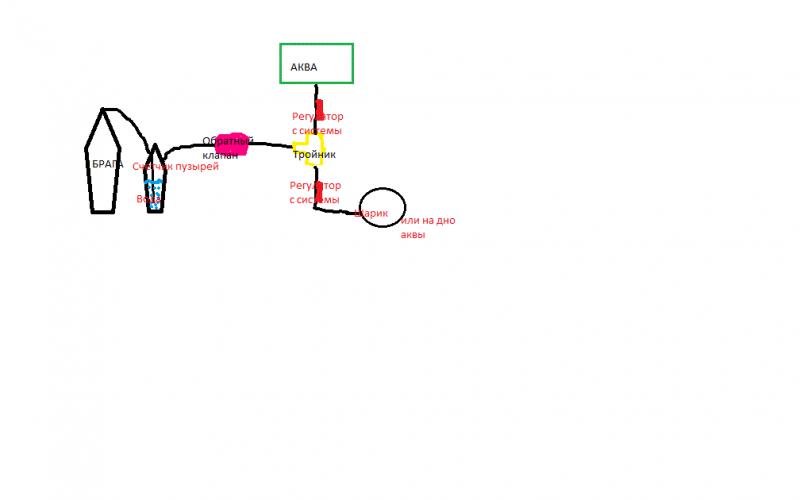 Если надо могу, но позже выложить фото или приблизительную схему(если непонятно на словах) - Бутыль(брага) "в" 0,5пластиковая бутылка(что-то вроде счетчика пузырьков) "из" нее "в" обратный клапан "в" тройник, дальше из тройника одна трубка с СО2 в акву-типа реактора, вторая для ночи(уход лишнего СО2, я опускал на дно чтоб было давление и СО2 просто в воздух не выходило), - ну и два зажима с аптечной "система"(причем трубки у мня от туды же), чтоб регулировать на какую подавать или закрывать СО2.