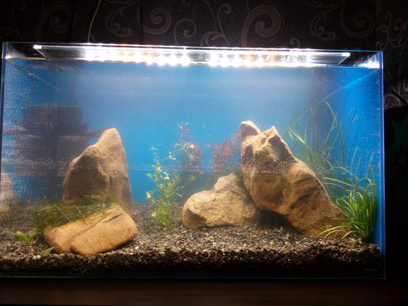Приветствую всех, запустил 28.02.2015 свой первый в жизни аквариум, 60х31х36, освещение LED Aqualighter 2 60cm, грунт заказывал базальт, но на сколько я понял приехала гранитная крошка 2-5мм, камни из Карпат нейтральны, фильтр aquael turbofilter 500 только с губкой никаких био или хим очистителей не кидал, обогрев resun 100w, вода водопровод t25,5 ph ~7.7-8, gh ~4, kh 12-13, рыбы 7 неонов,5 данио, 30 креветок черри, удо купил микро и макро от Ермолаева,но пока не лью я так понимаю что еще рано, грунт тоже чистый без подложки.