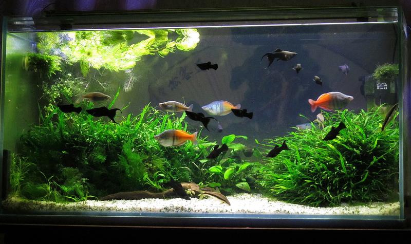 Объем около 100 литров,фильтр JBL-900,свет 6 шт.ламп Т8(половина Филлипс Акварель),вода КН-8.Обитатели два самца и самка Melanotaenia boesemani,стадо черно-белых молли,стайка родостомусов и Hemigrammus erythrozonus,две пары оtocinclus affinis, из растений бликса,,хедуотис,гидрокотила,эхинодорусы,глосса,мо х и другие,но акцент делался на Ludwigia sp. "Mexico"(в центре)-очень красивое и мной любимое растение! Фото аквы в альбоме