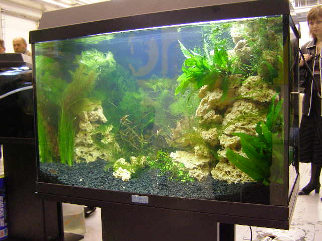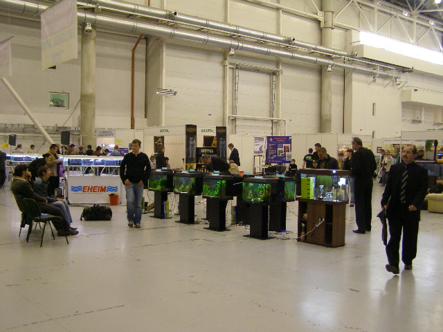 В 12:00 еще часть народа распаковывала коробки и устанавливала инвентарь. Участников не много, но те кто был представлены не плохо. Особенно понравился стенд Серы (представлен дистрибьютор; много всего, особенно на фоне отсутствия в продаже серовских товаров) и стенд Сергея Марченкова (много JBL). К сожалению, по причине нехватки времени, никакие семинары не посещал. Хотя народ на втором этаже бодренько тусовался. Особенную грустность вызвало решение организаторов продавать всякую-всячину только в субботу (наверное придется идти еще раз). Аргумент - что в противном случае все раскупят в первый день. Могли бы привезти поболее товаров или же продавать в одни руки не больше 1 кило (шутка). В принципе это же не ярмарка, а выставка. Кстати, от оформления большинства аквариумов ожидал большего.