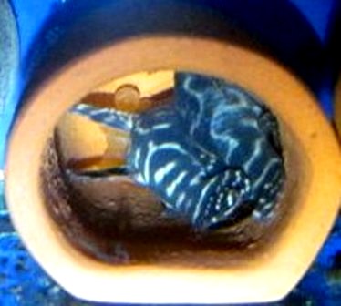 Личинку впервые увидел 20 февраля, а 25.02 попытался вытряхнуть жителей трубки в отдельный аквариум и сразу же столкнулся с проблемой – сколько бы я не переворачивал трубку, сколько бы не пытался смыть обитателей водой, у меня ничего не получалось. Самец удерживался в трубке с помощью растопыренных плавников и это объяснимо, а вот мальки удивили – как будто на присосках держались на пористой керамике, что особо удивительно.