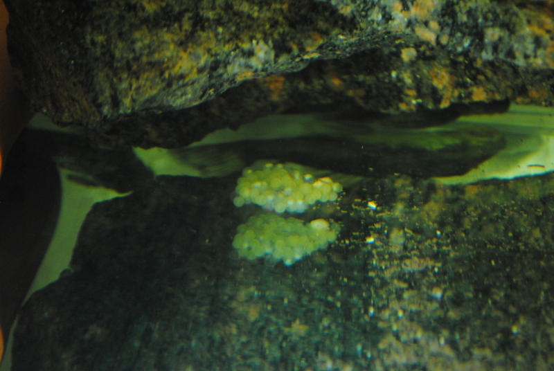Вчера, поздним вечером, в аквариуме, где произошел нерест стурисом обнаружил еще одну приятную неожиданность - в самом укромном месте, где и рассмотреть толком ничего нельзя, в отражении на дне увидел, что самый большой из моих L 168 находится на кладке икры. С трудом удалось сфоткать вот такое
