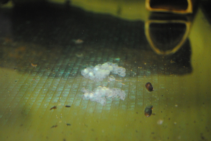 Утром стало ясно, что эксперимент с возвратом икры самцу не удался - кладка лежала посреди аквариума и было заметно, что кто-то принял ее за потенциальную еду, но до конца начатое не довел.