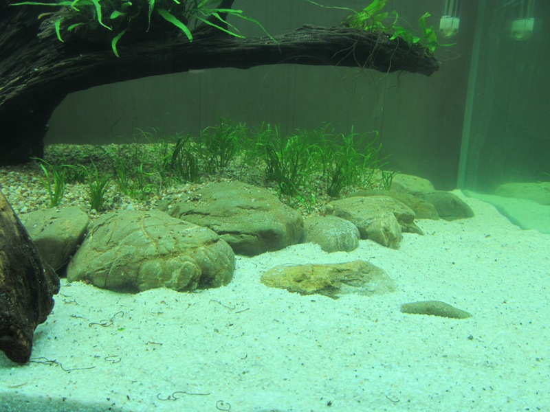 Согласен.Камни маловаты для этого аквариума, но других, к сожалению, нет. Чуть-чуть их можно будет поднять, но существенно ничего не изменится. А пока попробуем вырастить коврик с кубы и постараемся, чтобы он максимально стелилсятся по грунту и не рос в верх. А позже, может и камни побольше появятся и можно будет их потихоньку заменить