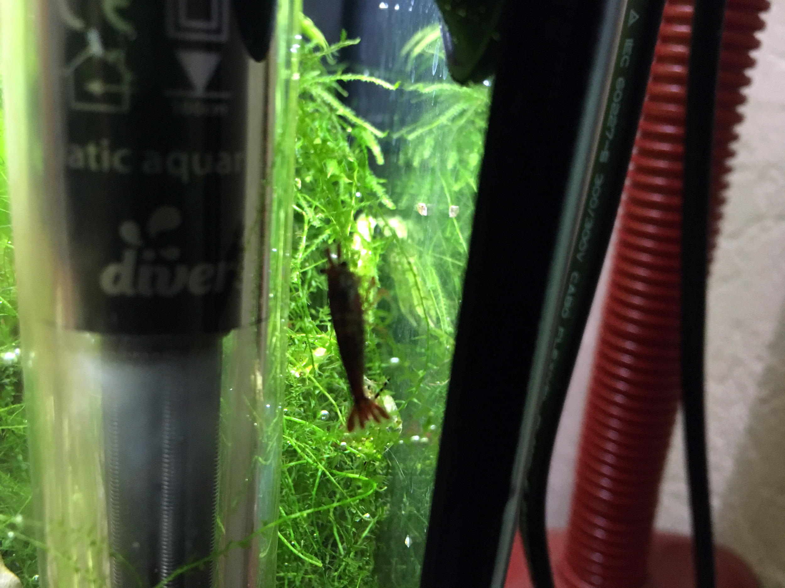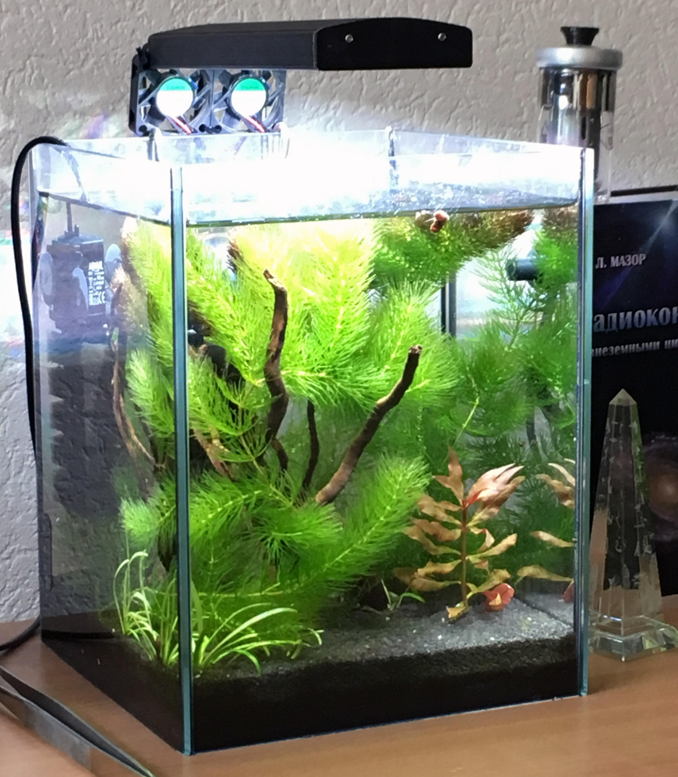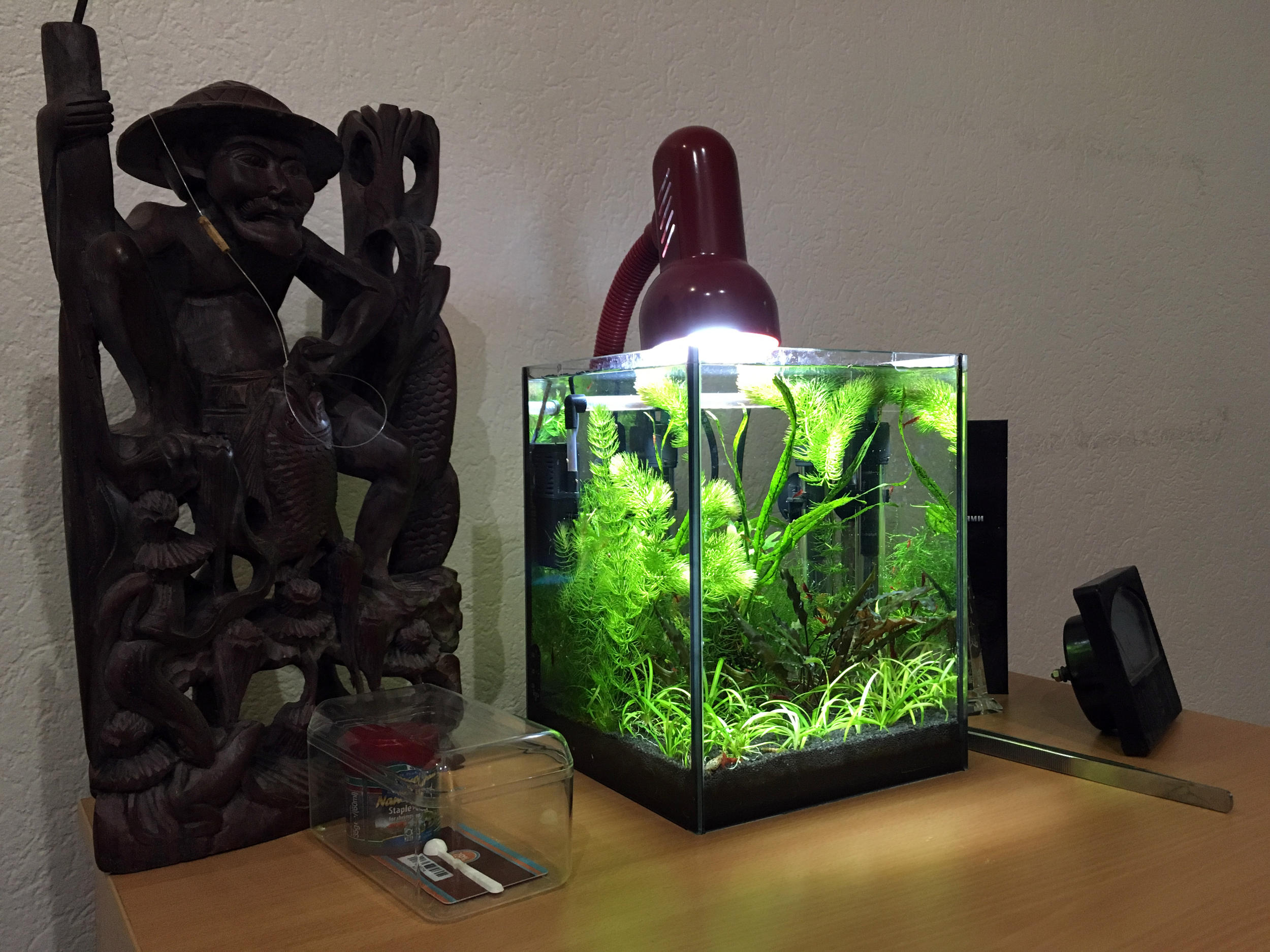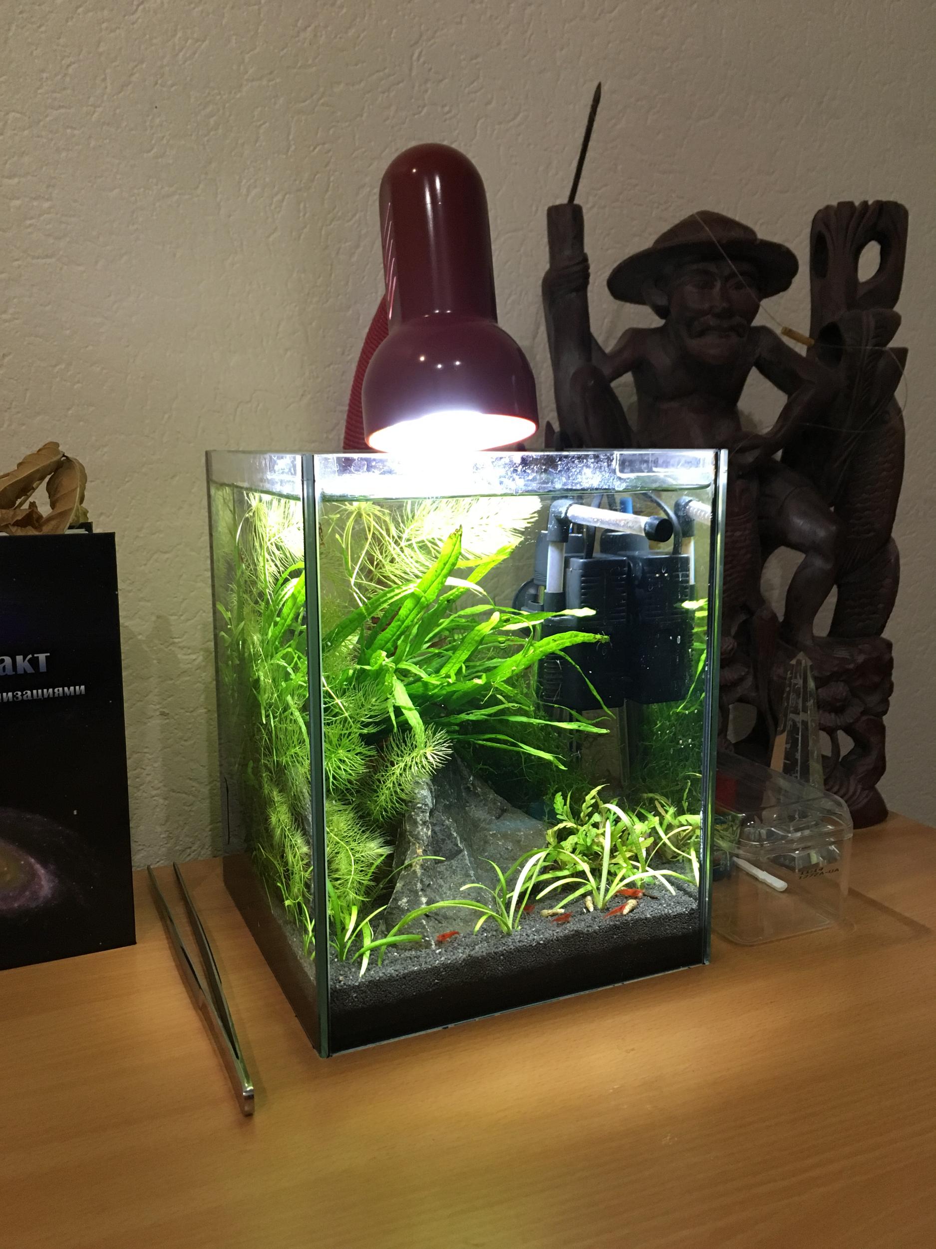 Стоит себе. Запускал 15 креветок. Сейчас более 40. Водорослей нет. С растениями приезжала спиругира (нитка), не выдержала вместе с мхом пламя зачахла. Папоротник чахнет, т.к. нет СО2.