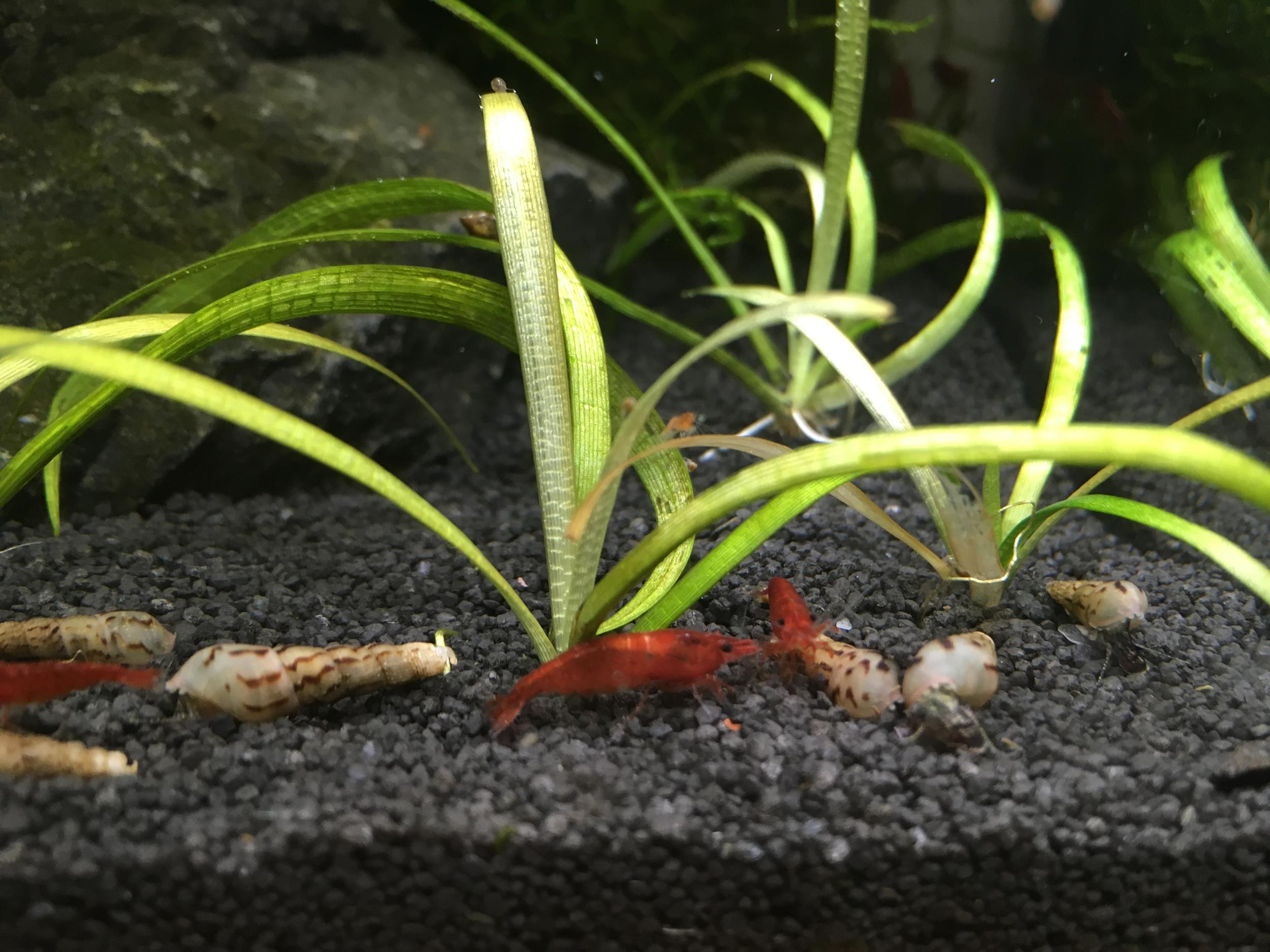 В феврале 2017 подсадил новые растения без обработки, ориентировочно через месяц увидел планарий. Сам виноват, что не обработал растения. Потом борьба с планариями. Подмены - водопровод + осмос. Когда не было осмоса для долива, то наливали кулерную заказную воду. Не знаю что так повлияло, но креветульки гибли. Умерли и мелании. На данный момент из 50 креветок осталось 2-3 шт.
