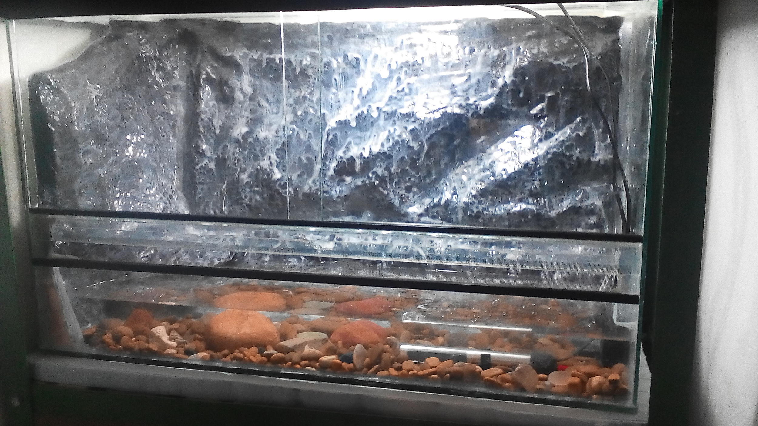 Поменяли цвет. И вообще все розобрали кроме надводной части, ее вытянули и потом поставили назад. Все перемазали силиконом и залили швы смолой толщиной в палец. Сделали пещеру, потому что любит дето прятаться.