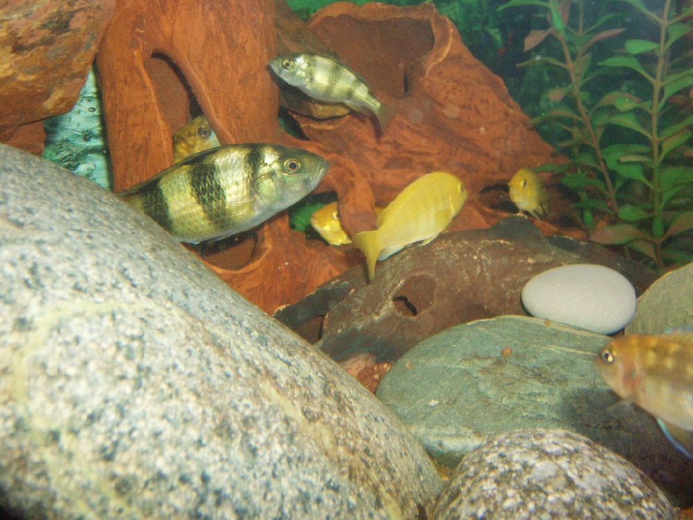 Решил поделиться радостью: три-четыре месяца назад наконец то купил свои самкам (Хаплохромис латифасциата, хоть в Омске у нас их называют Хаплохромис Джонстона) маленького самца. Самец вырос и вчера отненестился с одной из самок)