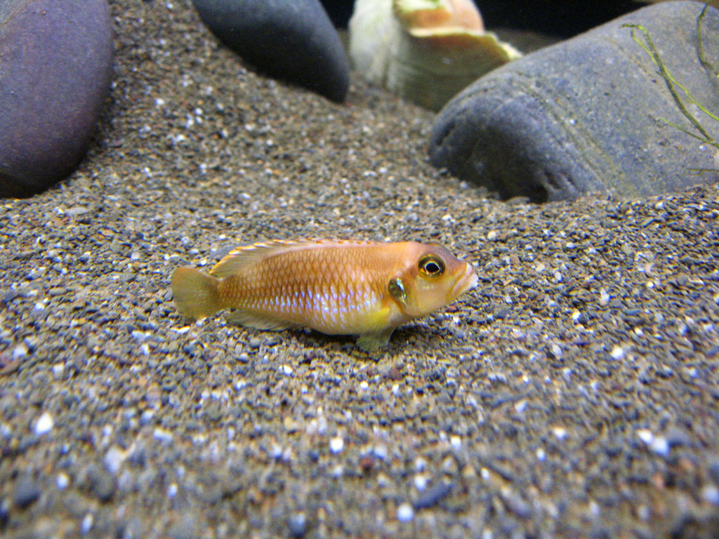 Ещё есть свежие фото Lamprologus ocellatus 'gold', у меня к ним особая симпатия. Очаровательные рыбки, во всех отношениях, красивым окрасом, и забавным поведением. Эти крохи обладают характером пит-буля, отважно кидаясь на всё, что приближается к их раковине.